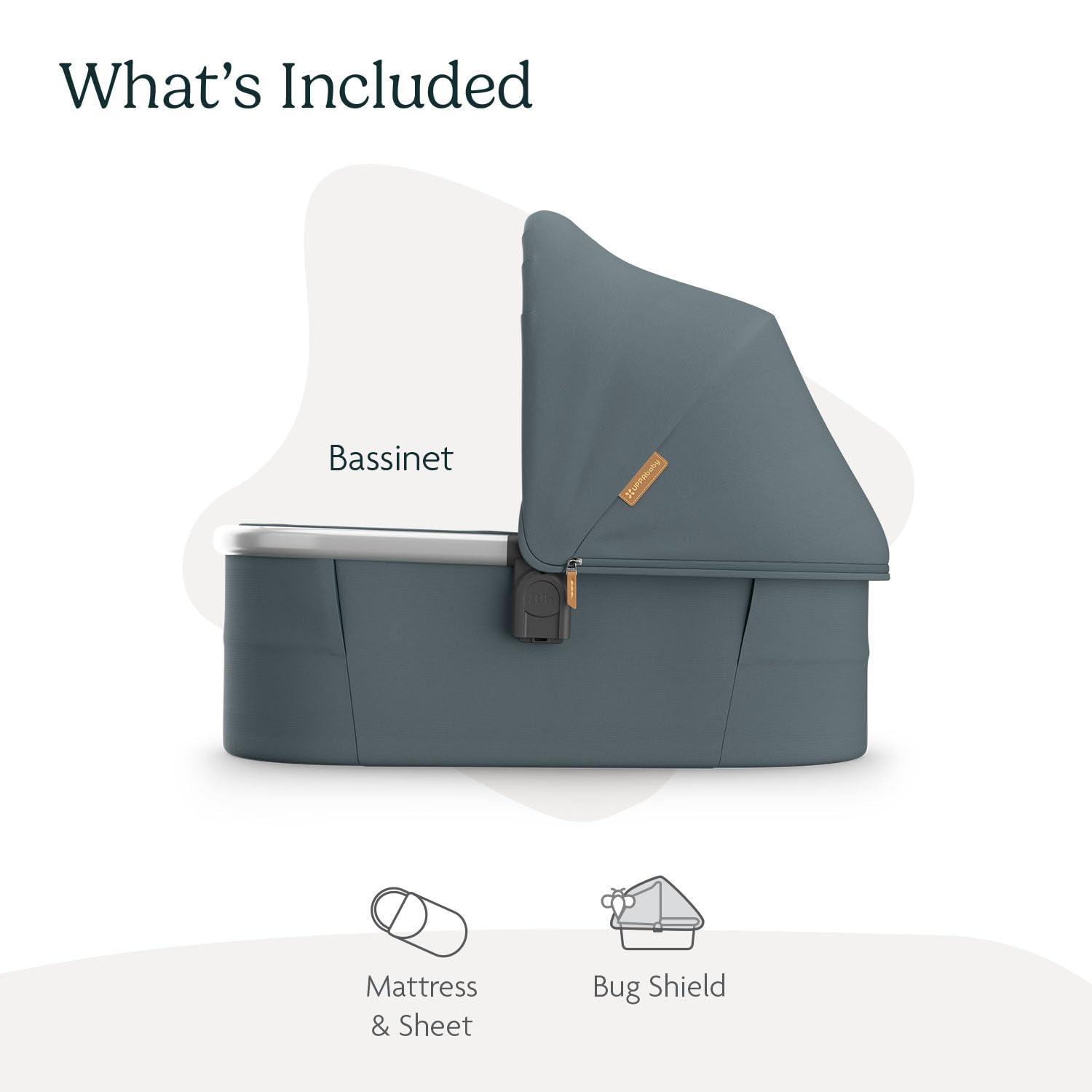 UPPAbaby Bassinet V3 - Compatible with Vista, Cruz, Ridge Strollers - Overnight Sleep Solution - Mattress, Sheet and Bug Shield Included - Savannah (Pearl Gray Jacquard/Carbon Frame)(Callum (Stone Blue/Silver Frame))