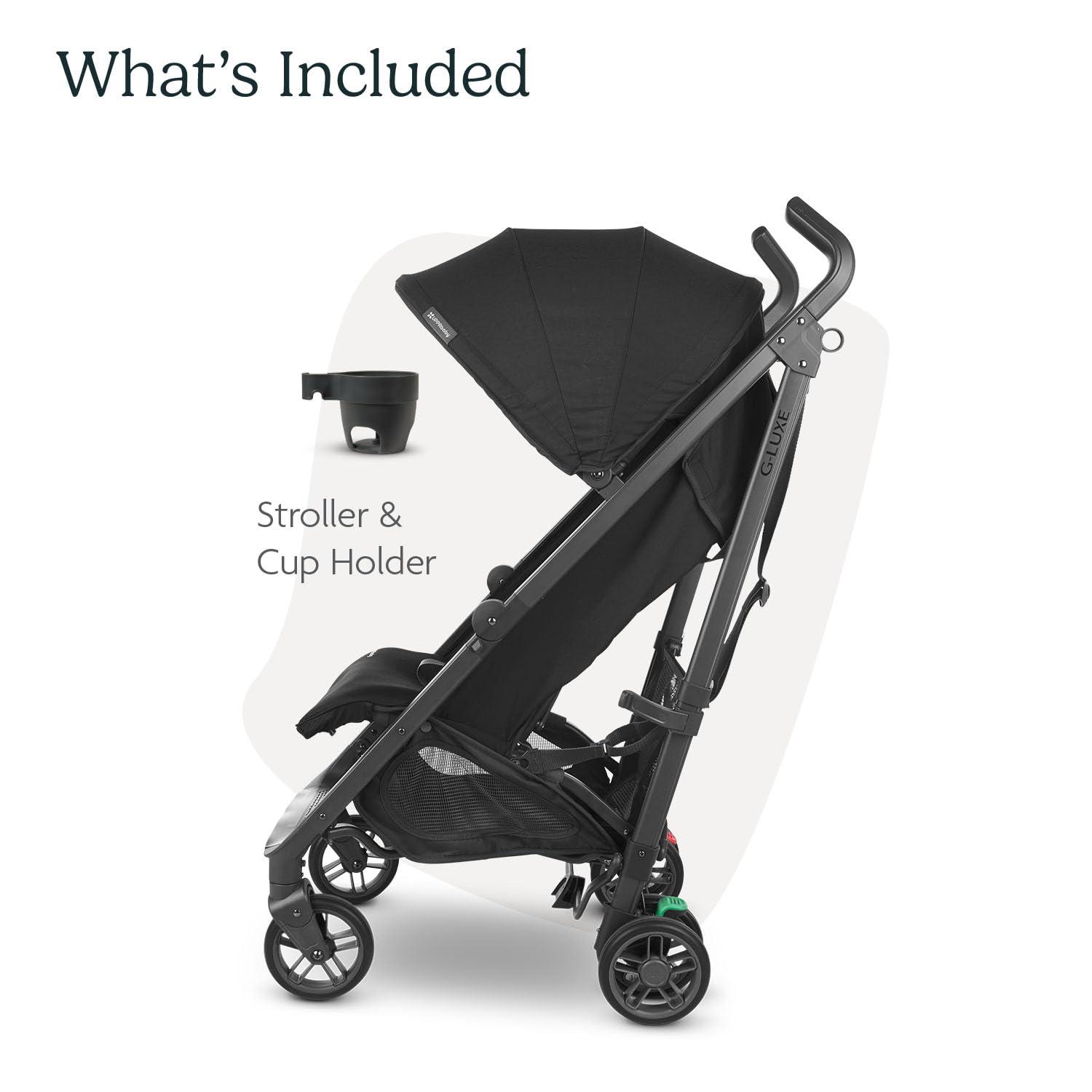 The UPPAbaby G-LUXE lightweight umbrella stroller provides flexibility every parent needs. Whether an ideal companion for running errands or the perfect ride for catching the sites while your little one reclines for a quiet nap, the G-LUXE has your travel needs covered. At just 15lbs you can easily pick up and carry over your shoulder or fold to a standing position and tuck into the corner. Elevated look/feel and branding that follows suit w/ the rest of our stroller line darker touch points Powder-coated frame for higher resistance wear • Lightweight aluminum frame with robust profile • One-handed actuated recline and adjustable leg rest • High-performance, 5.75” diameter wheels • Shock-absorbing, 4-wheel suspension • One-step brake • Ergonomic, PVC handles for comfort and easier pushing • Hand-level folding triggers—no foot action required • Large stretch knit canopy with extendable UPF 50+ sunshade for great sun and wind protection • Stands when folded • Easy to remove washable fabrics • Convenient carry strap • 5-point harness • Updated large, easy-access basket with 10 lb. weight limit • Removable cup-holder included