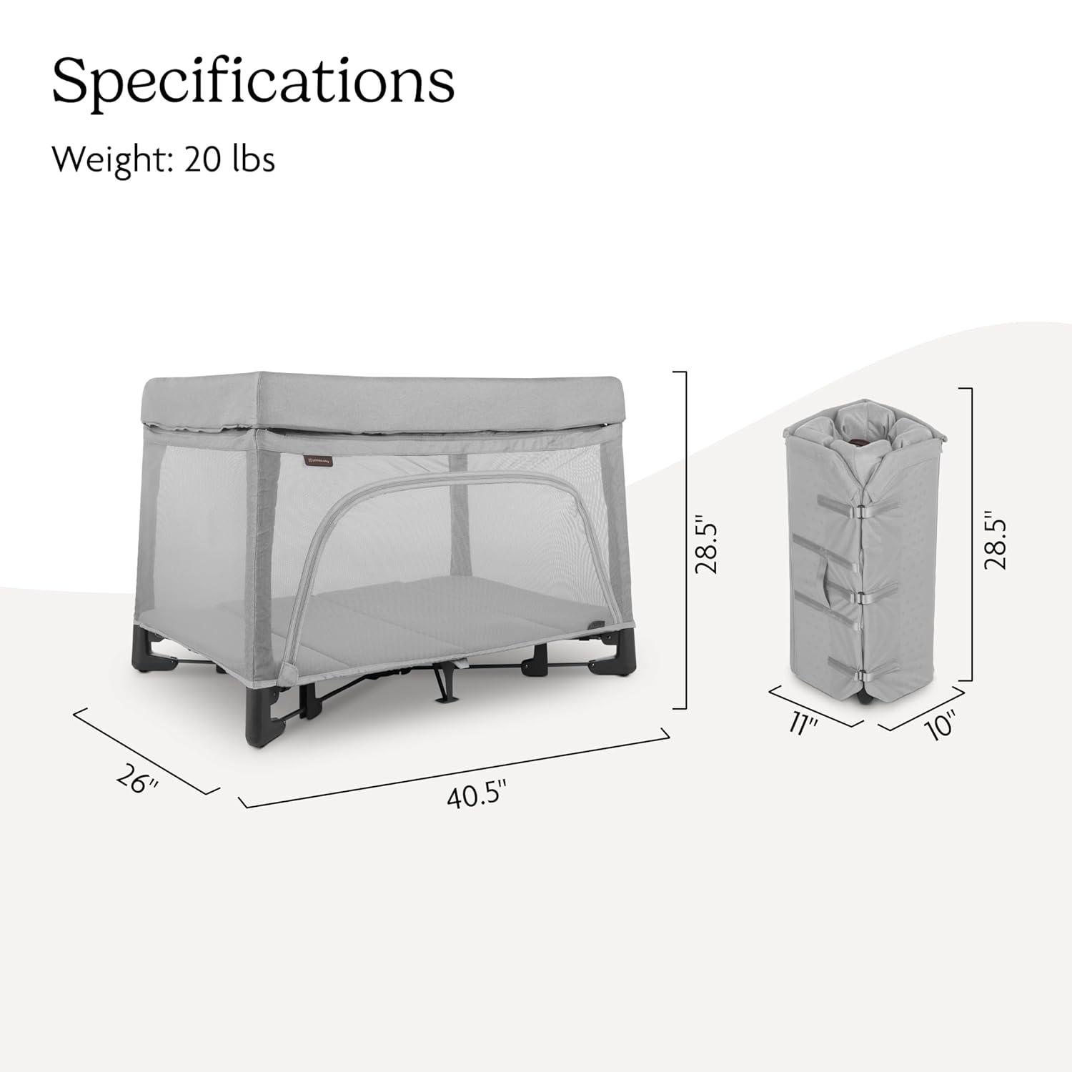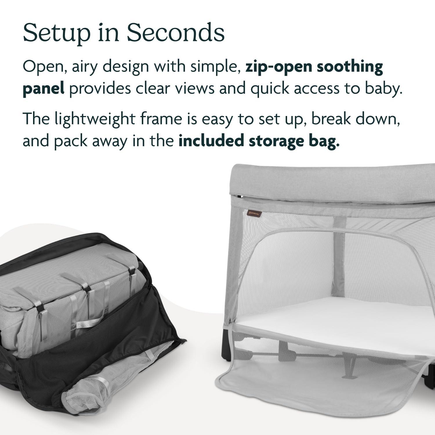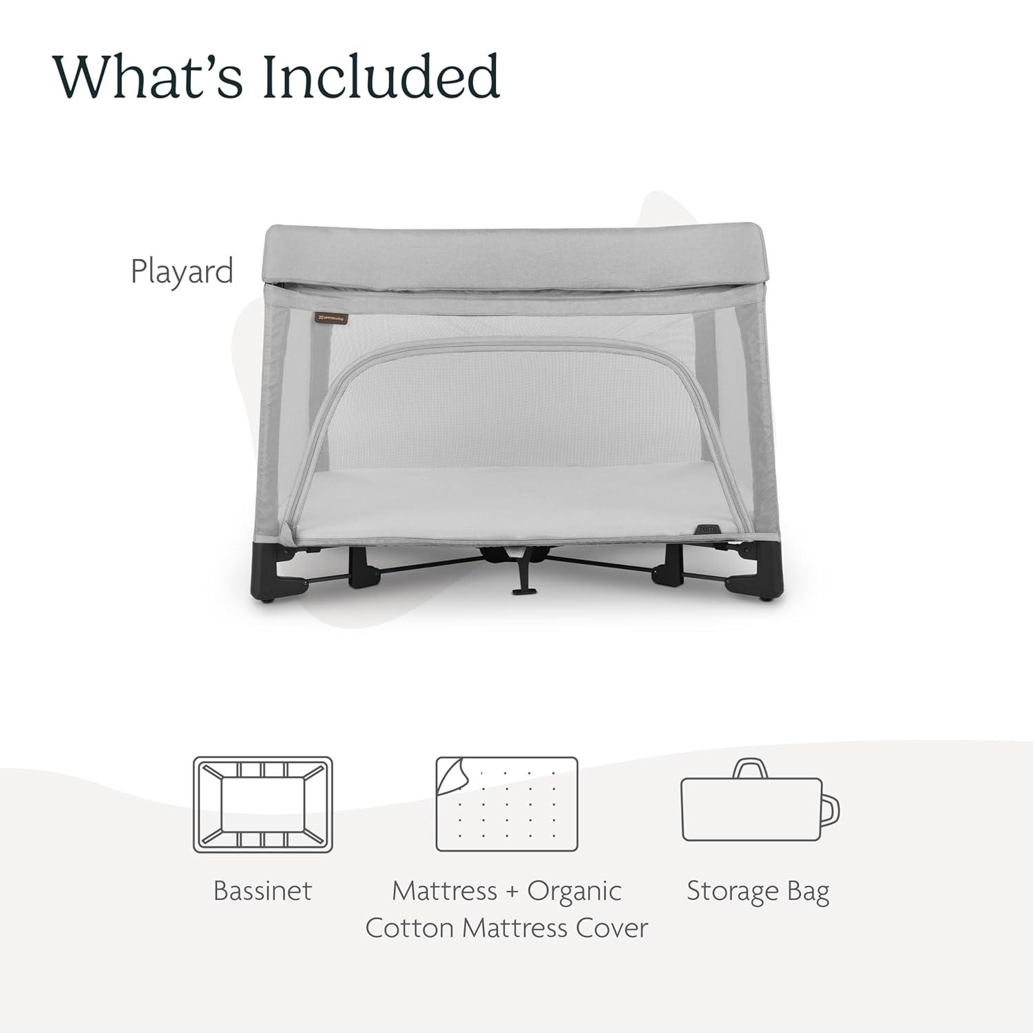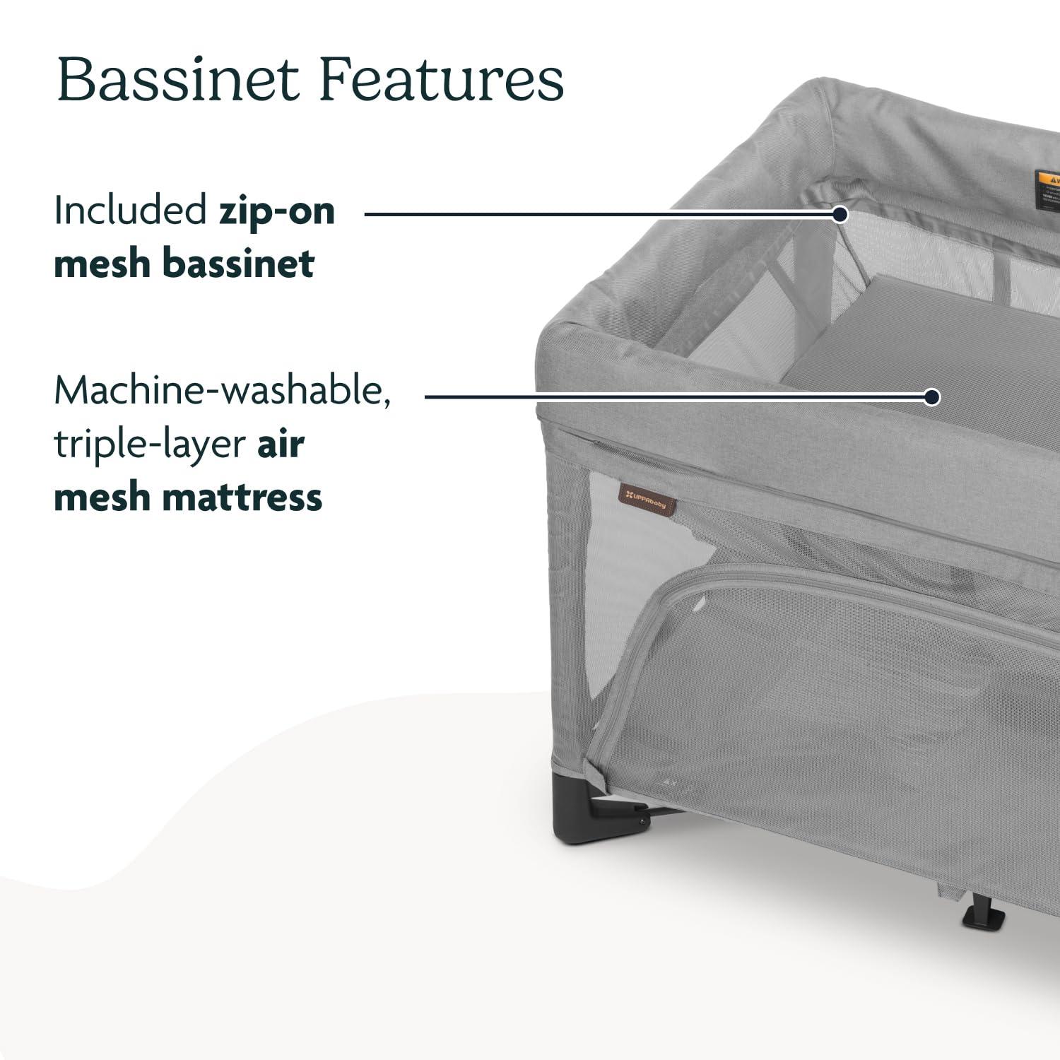 Travel and rest easy with the REMI, UPPAbaby’s first portable playard designed to help baby sleep soundly and safely. Featuring an air mattress (foam-free) and side zip panel giving parents a way to comfortably soothe their child to sleep. Its size, weight and quick set up turns into a go anywhere crib so adventures as a family become easier and more enjoyable. Folds and sets up in seconds with one-hand Triple layer air mesh mattress creates breathable, comfortable and healthier sleep environment for baby Zip open panel for a more comfortable access to soothe baby to sleep Easy to zip on mesh bassinet attachment for added ventilation and provides an elevated sleeping environment perfect for bedside Open, airy design provides clear views Above ground design to keep baby draft proof Durable, woven mélange fabric wraps around top rail for added comfort and softness Convenient storage bag included with pocket to store bassinet attachment Greenguard Gold Certified Playard: Suitable from birth to 35” tall Bassinet: Suitable from birth to 20 lbs Dims: 42″ L x 27″ W