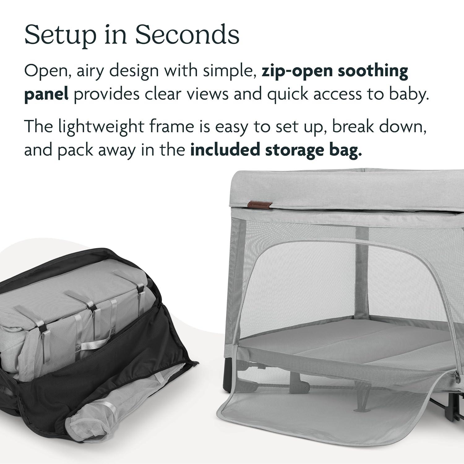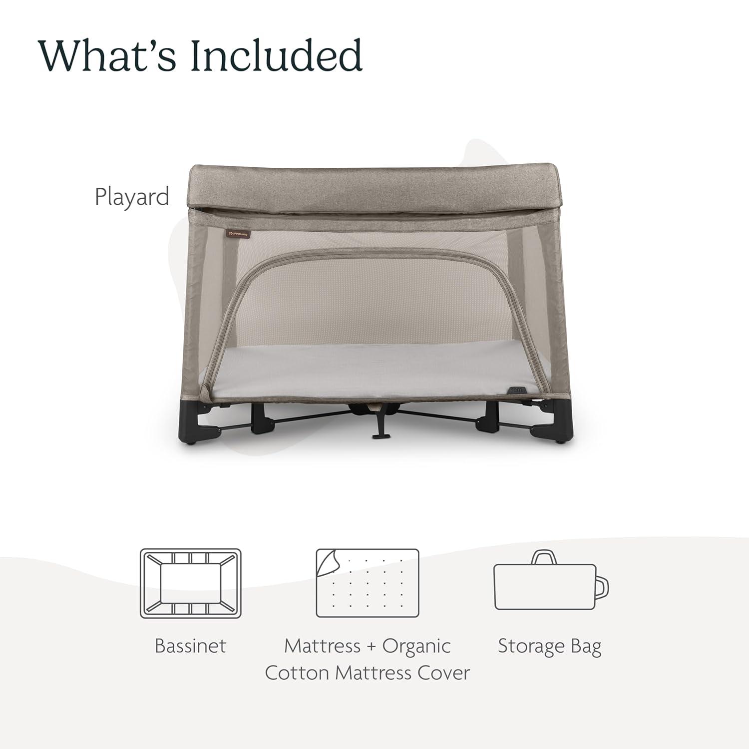 Travel and rest easy with the REMI, UPPAbaby’s first portable playard designed to help baby sleep soundly and safely. Featuring an air mattress (foam-free) and side zip panel giving parents a way to comfortably soothe their child to sleep. Its size, weight and quick set up turns into a go anywhere crib so adventures as a family become easier and more enjoyable. Folds and sets up in seconds with one-hand Triple layer air mesh mattress creates breathable, comfortable and healthier sleep environment for baby Zip open panel for a more comfortable access to soothe baby to sleep Easy to zip on mesh bassinet attachment for added ventilation and provides an elevated sleeping environment perfect for bedside Open, airy design provides clear views Above ground design to keep baby draft proof Durable, woven mélange fabric wraps around top rail for added comfort and softness Convenient storage bag included with pocket to store bassinet attachment Greenguard Gold Certified Playard: Suitable from birth to 35” tall Bassinet: Suitable from birth to 20 lbs Dims: 42″ L x 27″ W